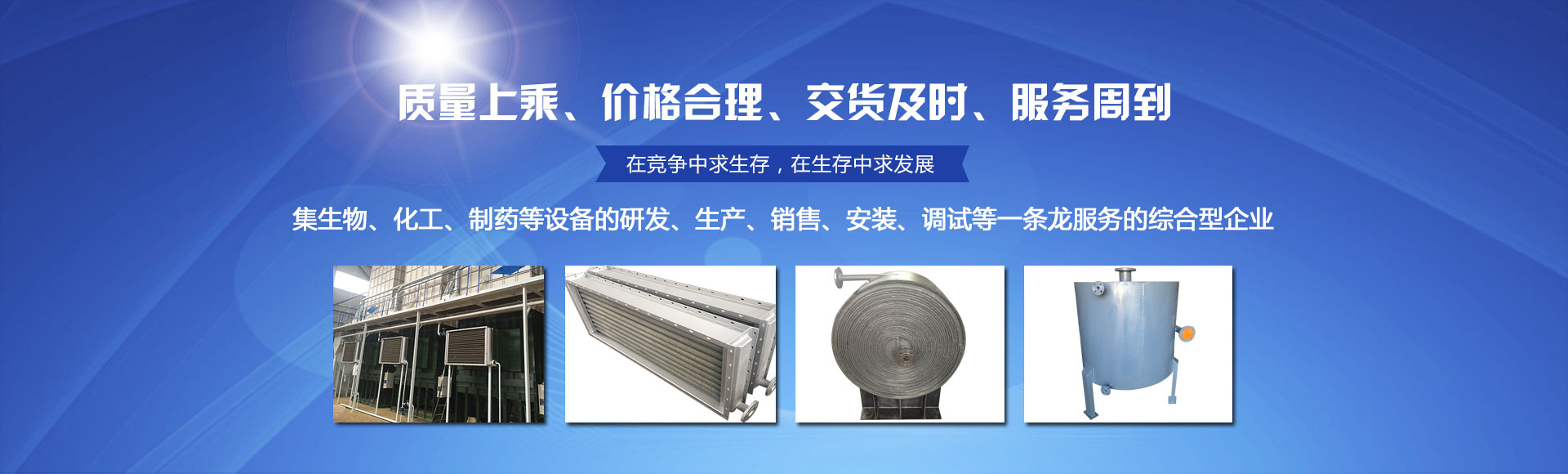 公司主要產品為:烘干機散熱器、空氣散熱器、耐高壓散熱器、螺旋板式換熱器、列管式冷凝器、不銹鋼反應釜、多功能分散反應釜、種子罐、提取罐、真空耙式干燥機、切片機、刮板薄膜蒸發器、真空減壓濃縮罐、儲罐、酒精回收塔、波紋填料等化工設備及各種散熱器。